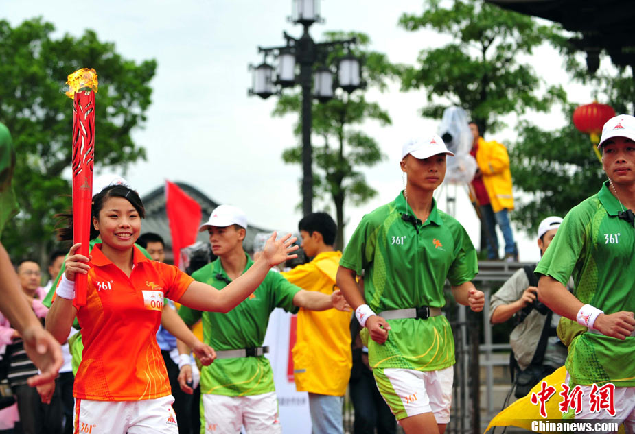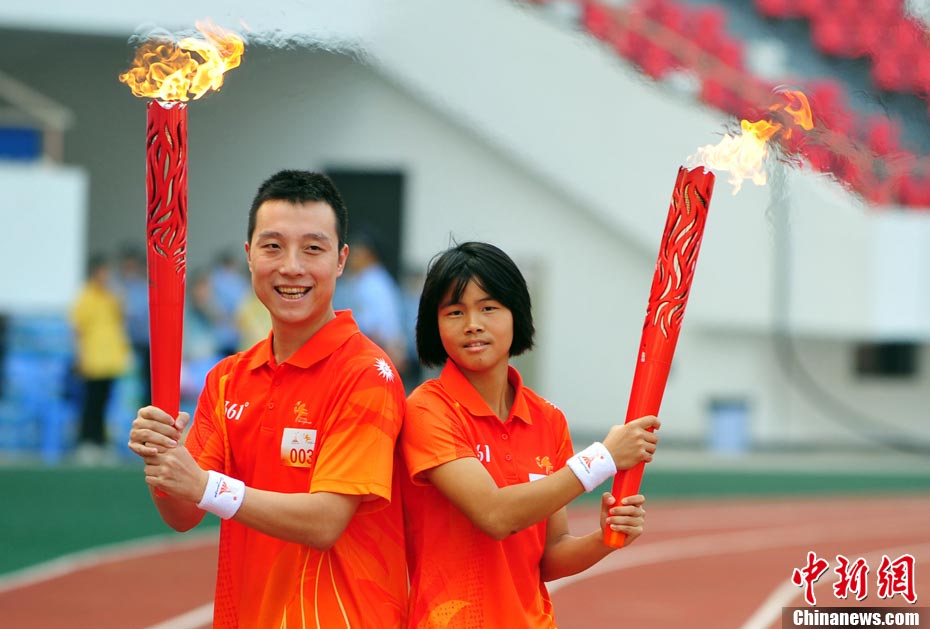 10月30日,第16屆亞洲運(yùn)動(dòng)會(huì)火炬在“禪宗六祖慧能故鄉(xiāng)”廣東云浮進(jìn)行傳遞。圖為浮市委副書記姚康與云浮站最后一棒火炬手、奧運(yùn)冠軍鄒市明。