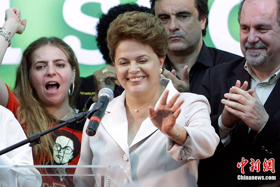 巴西當(dāng)?shù)貢r(shí)間10月31日選出該國(guó)首位女總統(tǒng),當(dāng)天巴西最高選舉法院宣布,根據(jù)已統(tǒng)計(jì)完的95%的選票,勞工黨候選人迪爾瑪·羅塞夫在第二輪投票中勝出,當(dāng)選總統(tǒng),F(xiàn)年62歲的羅塞夫獲得55%的選票,擊敗了唯一的競(jìng)爭(zhēng)對(duì)手前圣保羅州州長(zhǎng)、社會(huì)民主黨候選人若澤·塞拉。圖為10月31日,勞工黨候選人迪爾瑪·羅塞夫在巴西利亞舉辦獲勝演說(shuō)。
