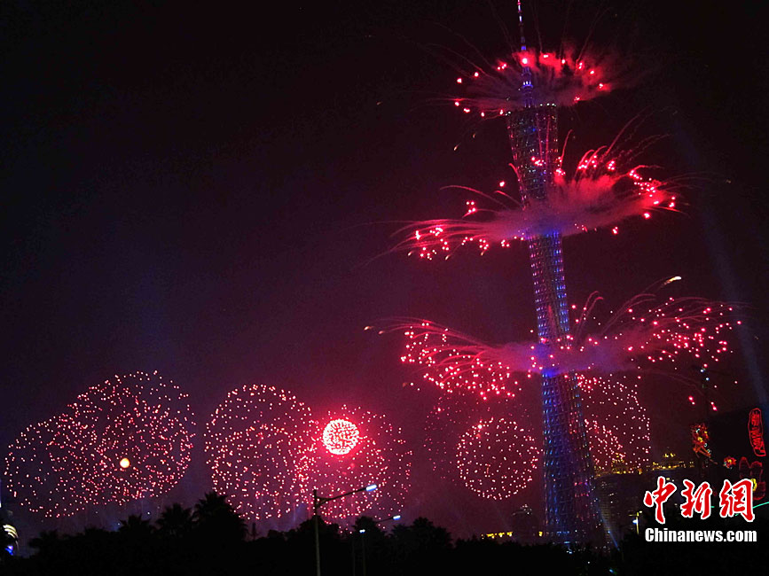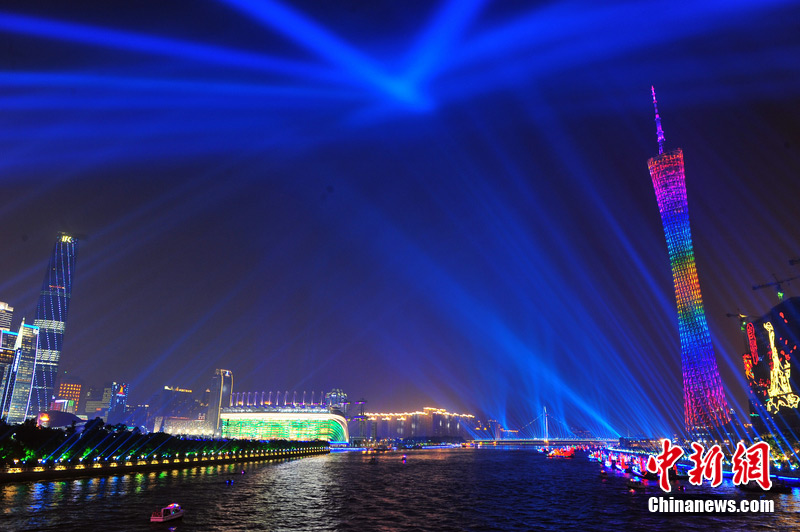 2010年11月3日晚,廣州海心沙上演包括煙花預演在內的亞運開幕式帶妝彩排。圖片來源:CFP視覺中國