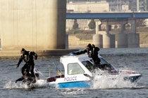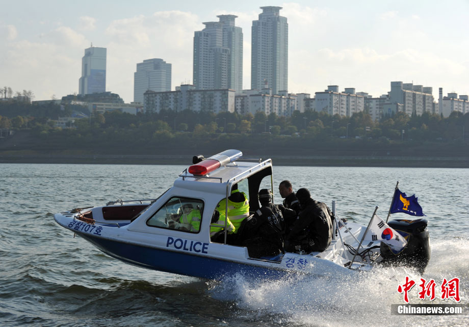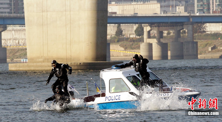 當?shù)貢r間11月3日,韓國首爾附近的漢江中韓國水警舉行了針對G20峰會安保工作的演練。