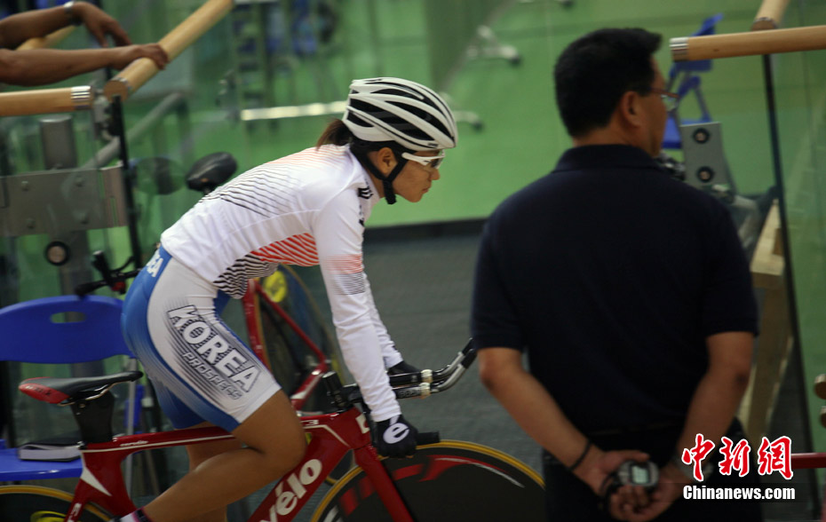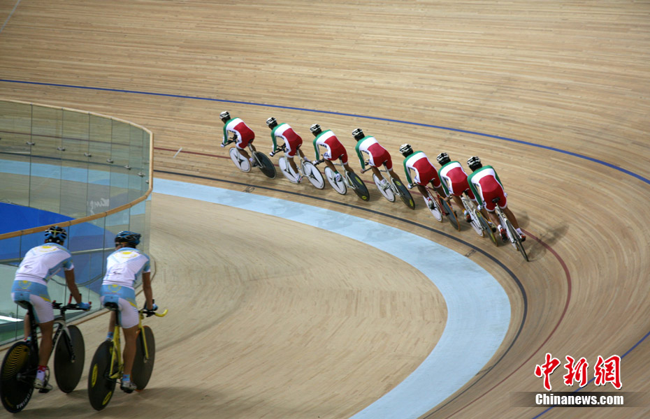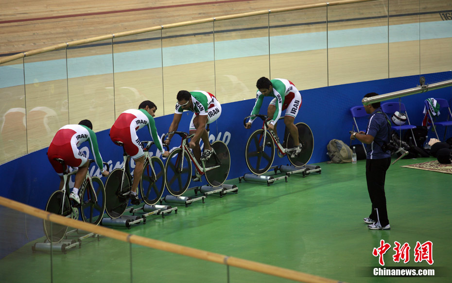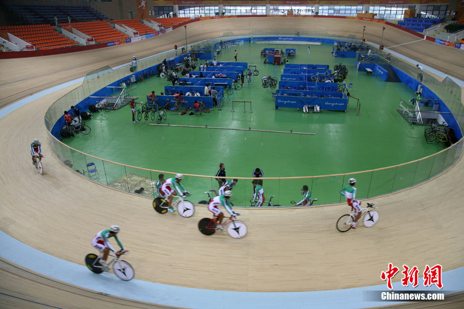 11月11日,廣州自行車輪滑極限運動中心內(nèi),來自伊朗、韓國、中國香港等國家和地區(qū)的自行車運動員進(jìn)行賽前場地適應(yīng)訓(xùn)練。中新社記者 張茵 攝