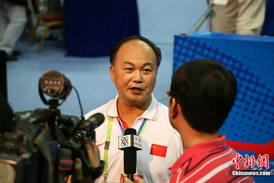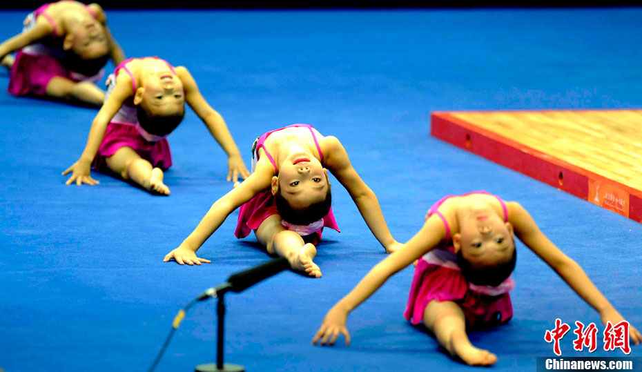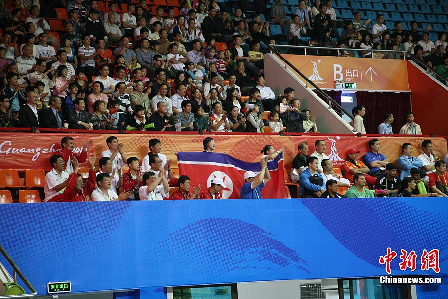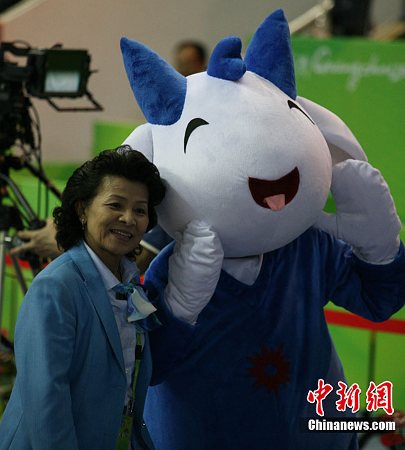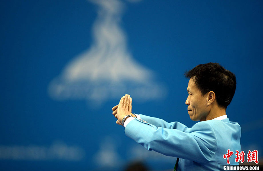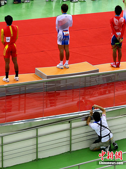 11月14日,在廣州亞運(yùn)會自行車競速賽中,中國隊(duì)的張磊、張淼和成昌松以44秒429的成績戰(zhàn)勝日本隊(duì),為中國代表團(tuán)再添一枚金牌。圖為在頒獎儀式前,工作人員為頒獎禮儀小姐整理服裝。中新社記者 富田 攝