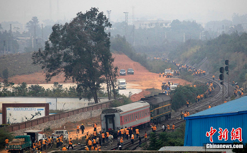 11月15日凌晨3時許,由北京開往湛江的k157次旅客列車在湘桂線柳南到達(dá)場脫軌,事故造成1節(jié)車廂脫軌,無人員傷亡,不影響行車。據(jù)介紹,脫軌車輛為機后第五位車廂,目前救援工作已經(jīng)結(jié)束,旅客已安全轉(zhuǎn)移,列車重新編組后繼續(xù)開行。事故原因正在調(diào)查中。圖為15日8時許,列車回歸正常軌道并離開事故現(xiàn)場。圖片來源:CFP視覺中國