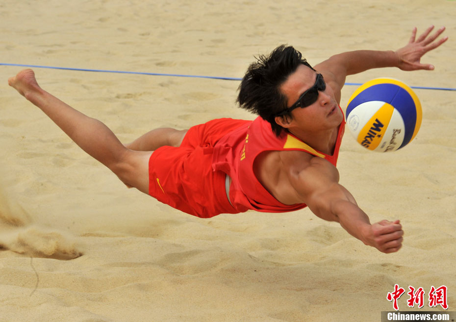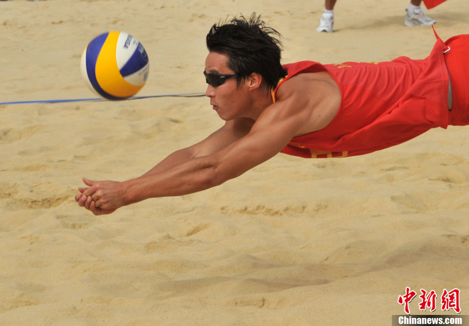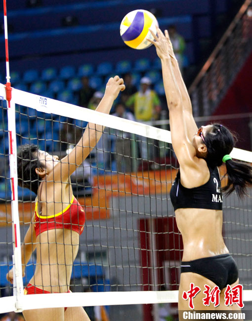 第十六屆亞運(yùn)會(huì)沙灘排球比賽11月15日拉開帷幕,在晚上的比賽中,馬來西亞組合(右)陸塔華/馬順婷戰(zhàn)勝中國選手黃影/岳園。中新社記者 趙振清 攝