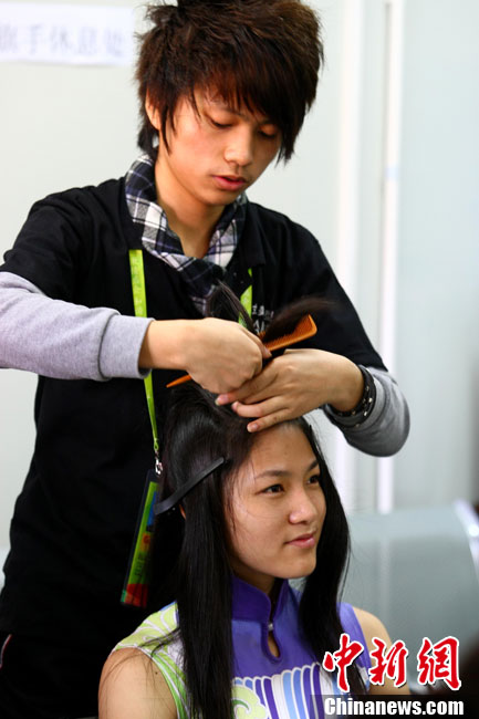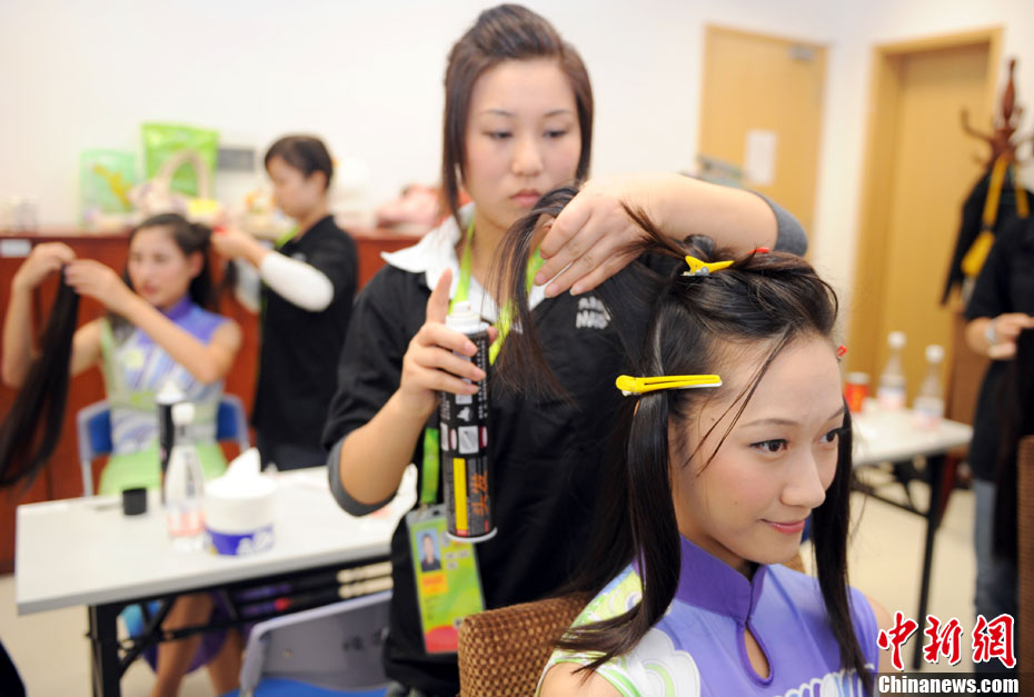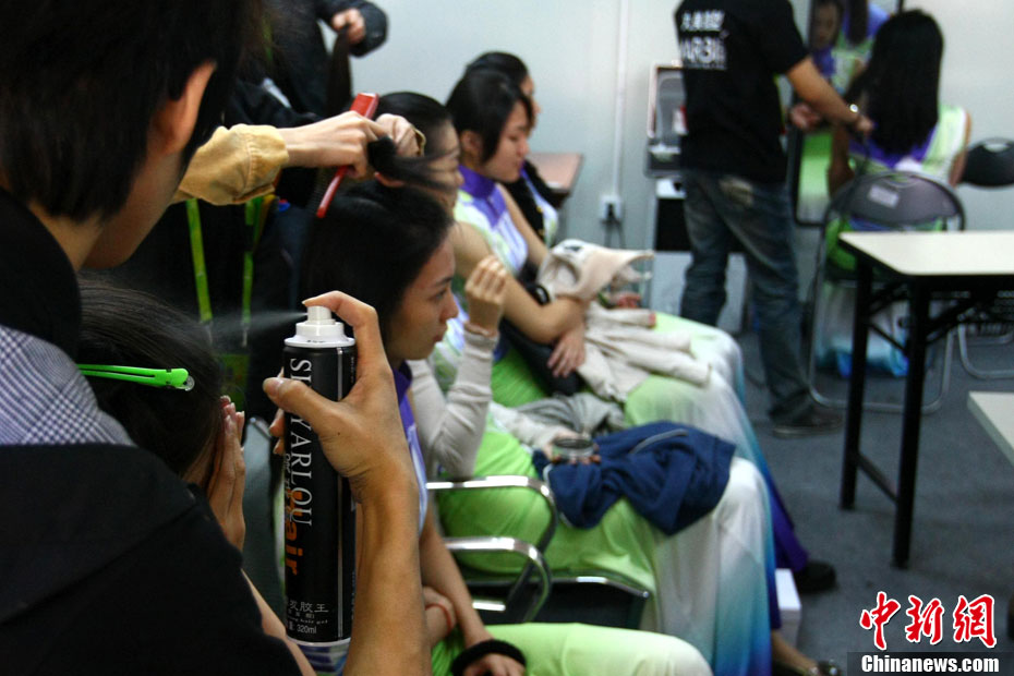 廣州亞運(yùn)會(huì)比賽開始后,對(duì)于這些美麗的姑娘們“戰(zhàn)斗”才剛剛打響,她們每天早上6點(diǎn)半就起床,趕到賽場(chǎng),開始4個(gè)小時(shí)的準(zhǔn)備工作——化妝、做頭發(fā)、整體造型,這一切都為頒獎(jiǎng)典禮的那短短一刻。