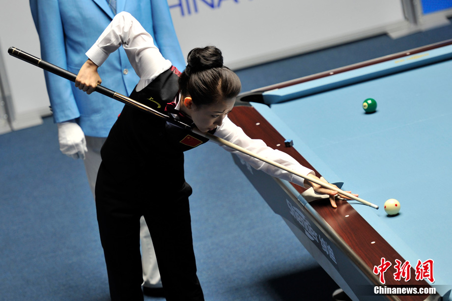 11月19日下午,廣州亞運(yùn)會女子美式9球單打決賽在亞運(yùn)城體育館上演,經(jīng)過2個多小時的激烈角逐,中國選手潘曉婷以7:5力克中華臺北選手周婕妤,最終奪冠。中新網(wǎng)記者 金碩 攝