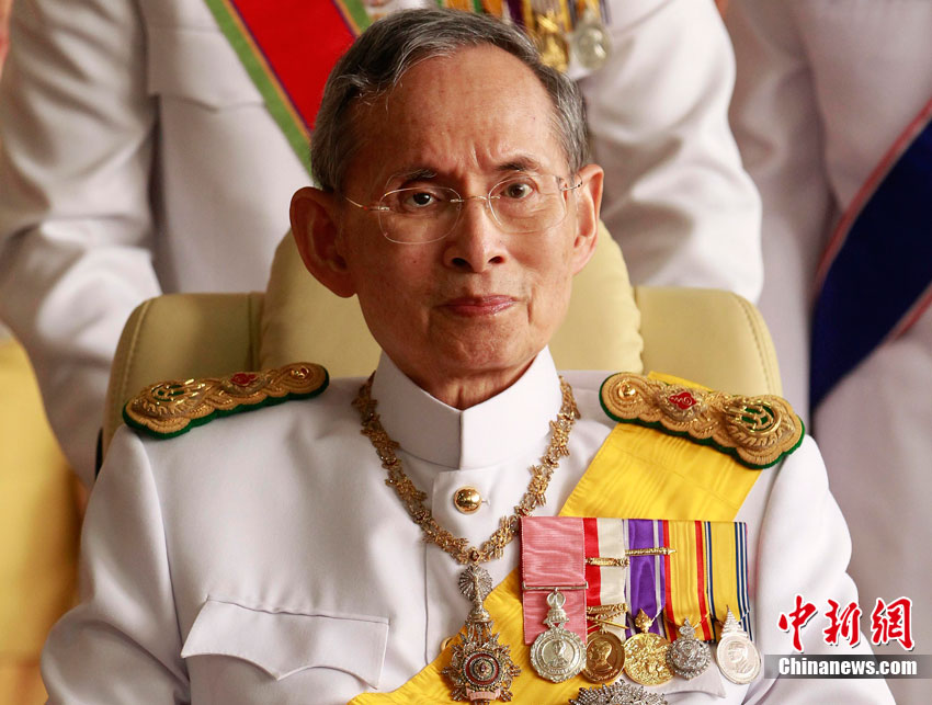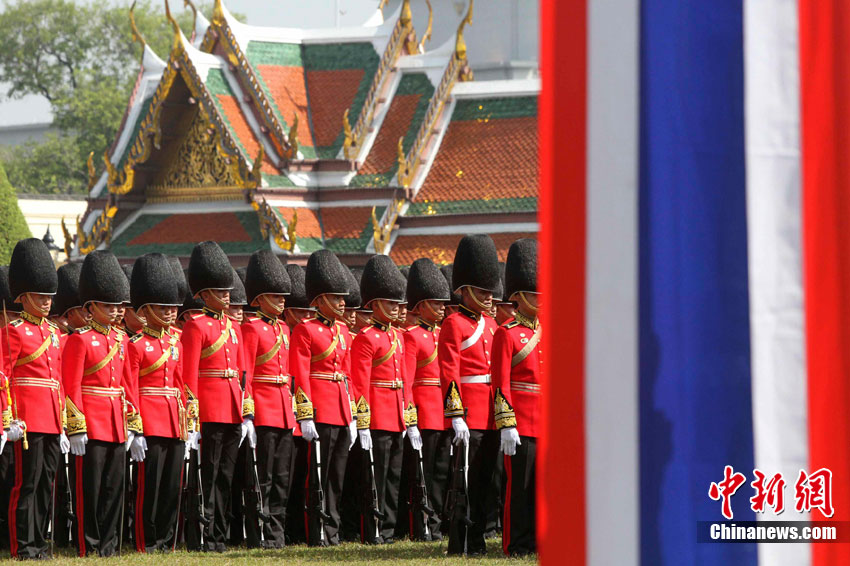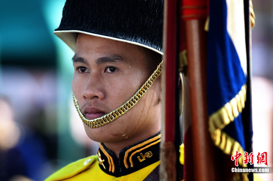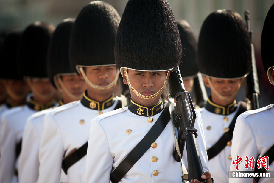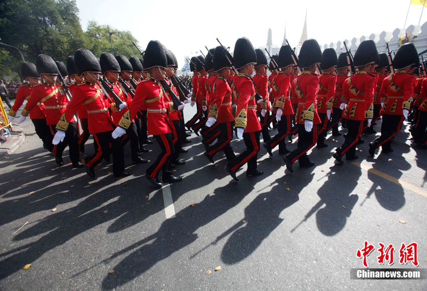 當(dāng)?shù)貢r(shí)間12月5日,泰國(guó)各界齊聚曼谷市中心的大王宮,慶祝泰王普密蓬83歲大壽。泰國(guó)皇家衛(wèi)隊(duì)士兵身著紅、綠、黑、蘭等各種顏色的軍服進(jìn)行游行,為泰王慶祝生日。