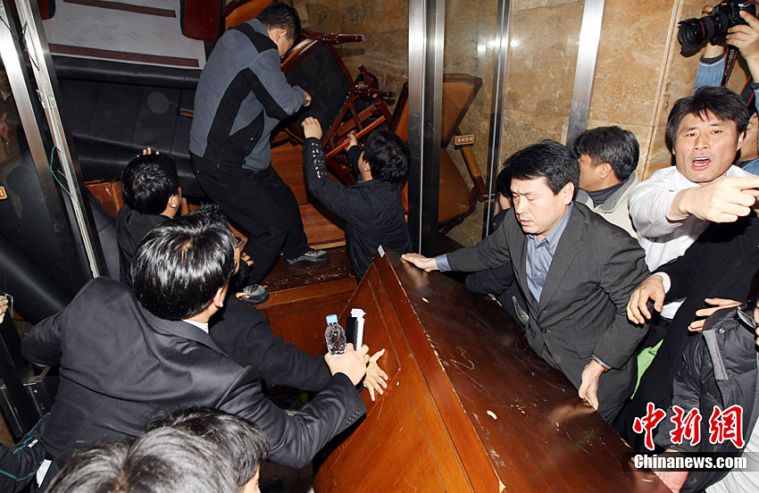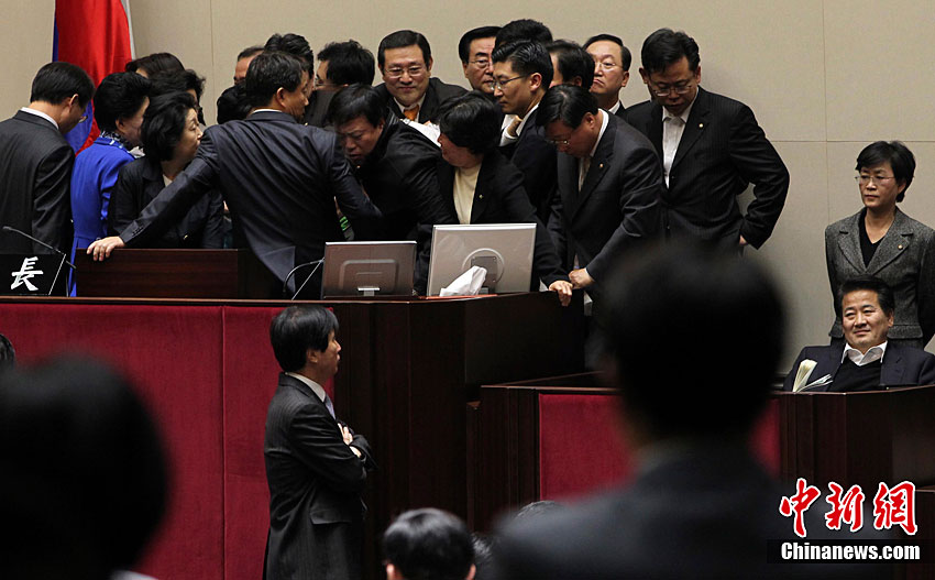 當(dāng)?shù)貢r(shí)間12月7日,韓國(guó)首爾國(guó)民議會(huì)大廳內(nèi),朝野議員再度爆發(fā)肢體沖突。據(jù)悉,本次議會(huì)會(huì)議的議題是2011年國(guó)家預(yù)算計(jì)劃案問(wèn)題。