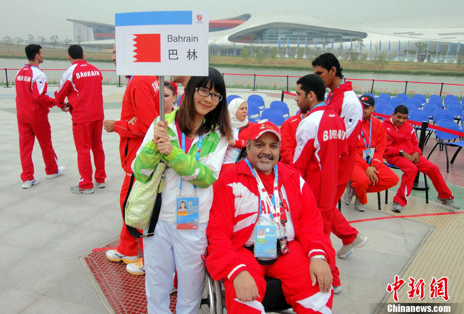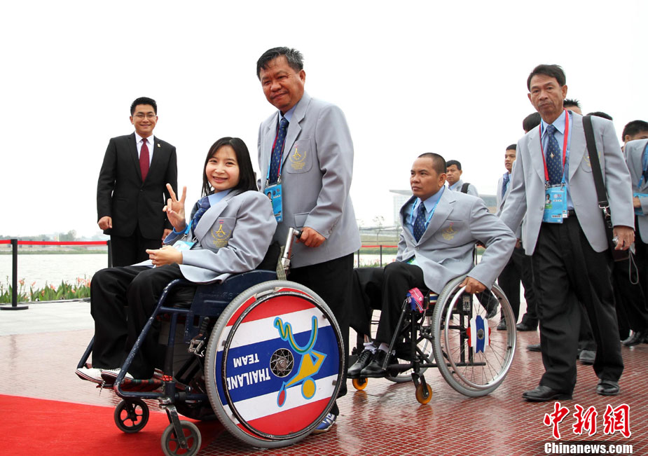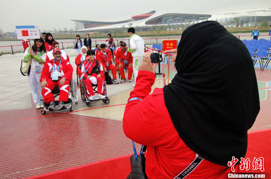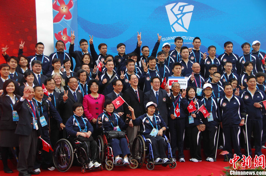 12月11日,廣州亞殘運會運動員村舉行體育代表團歡迎儀式,來自卡塔爾、尼泊爾、土庫曼斯坦、泰國、巴林、中國香港、中國澳門等國家和地區(qū)的運動員、教練員、官員在運動員村共享歡樂與榮耀。