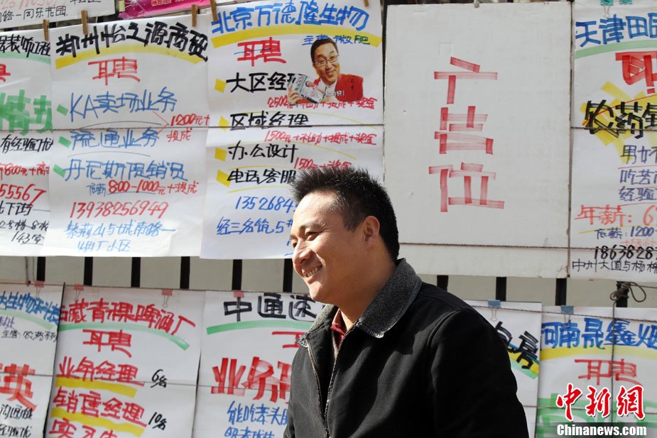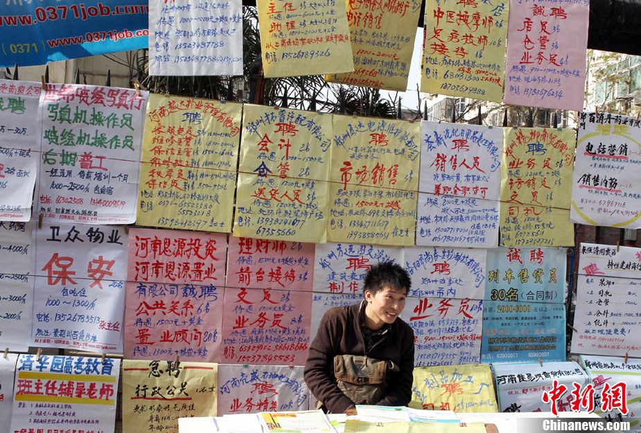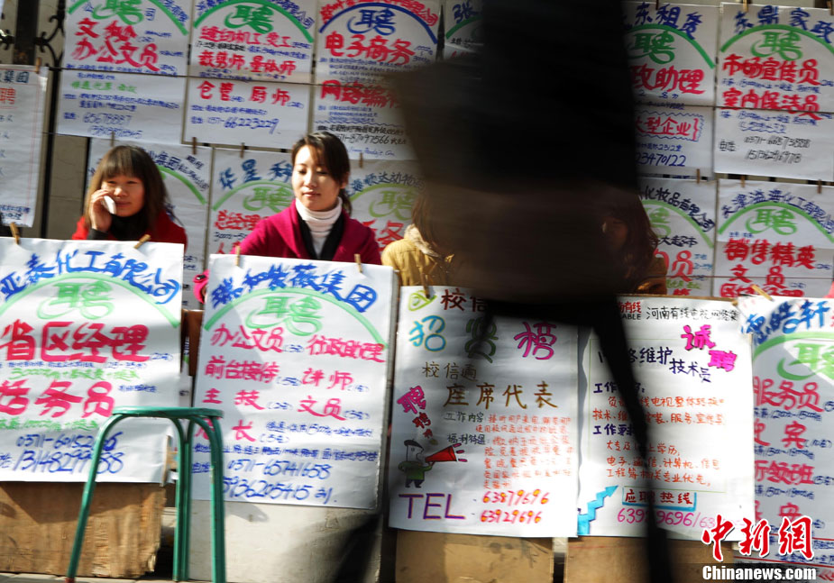 12月11日,年終歲末,在河南省人才市場(chǎng)的馬路上招牌用工者的美女招聘者坐成排等候應(yīng)聘者前來(lái)咨詢。許多企業(yè)反映,每到年底都有部分員工請(qǐng)假回家相親結(jié)婚或與家人團(tuán)聚過(guò)年,造成工廠人手不夠。