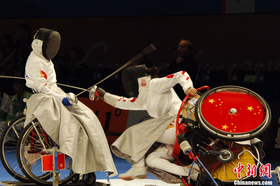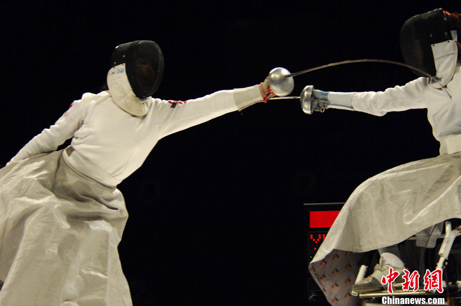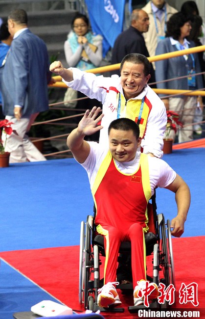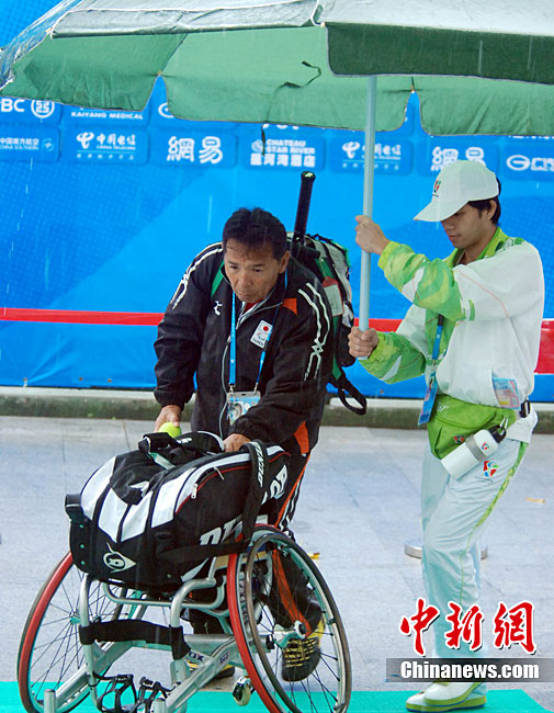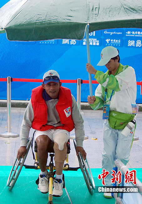 12月15日,志愿者雨天為運動員撐傘護航,無微不至。廣州2010亞殘運會,輪椅網(wǎng)球比賽在廣州天河體育中心網(wǎng)球?qū)W校舉行,因雨比賽從室外轉(zhuǎn)向室內(nèi)。尹雪峰 攝