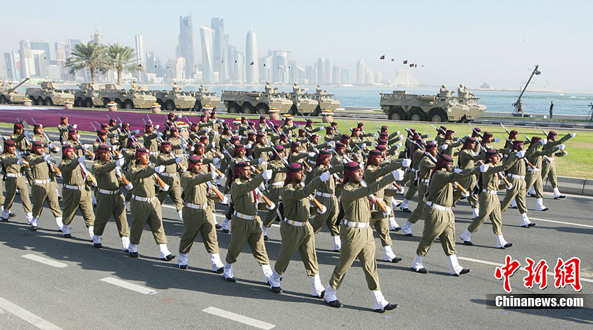 當(dāng)?shù)貢r間12月18日,卡塔爾首都多哈的海邊大道上舉行了盛大的國慶日閱兵式。