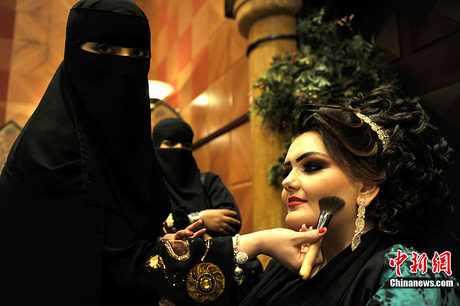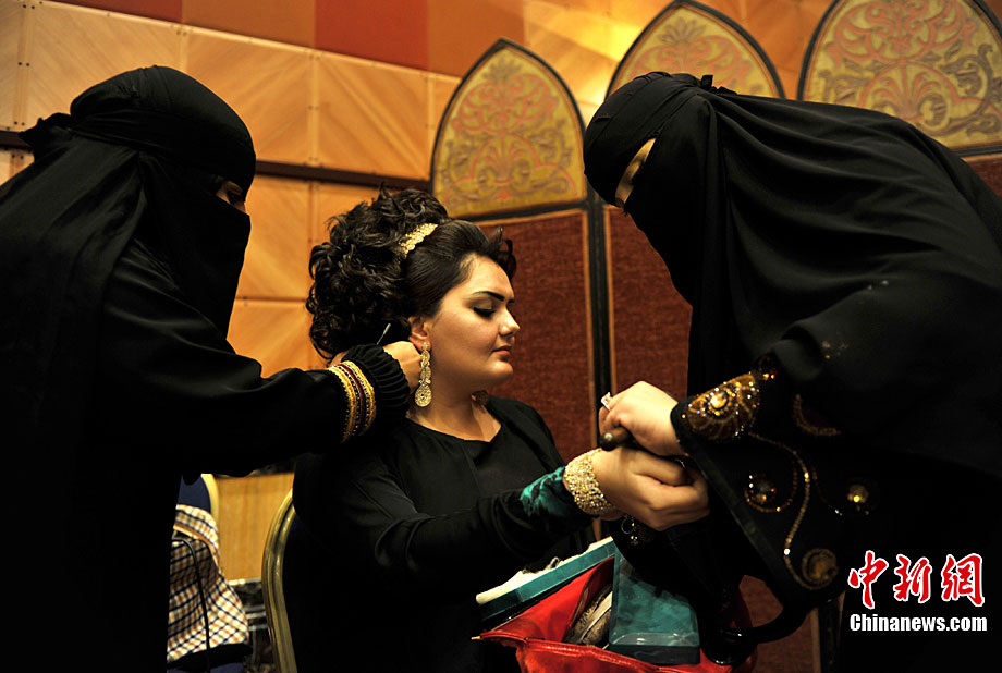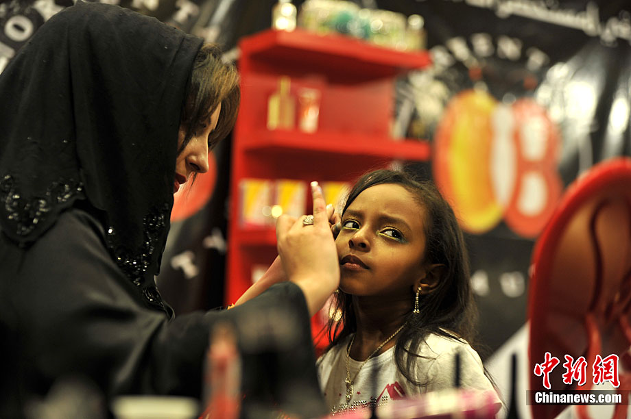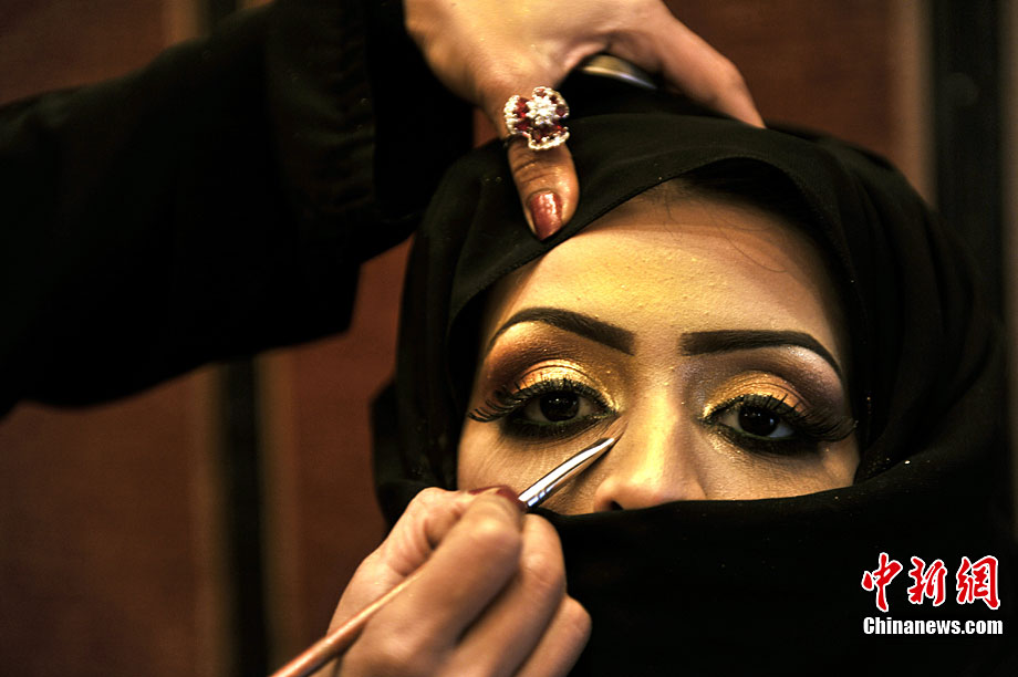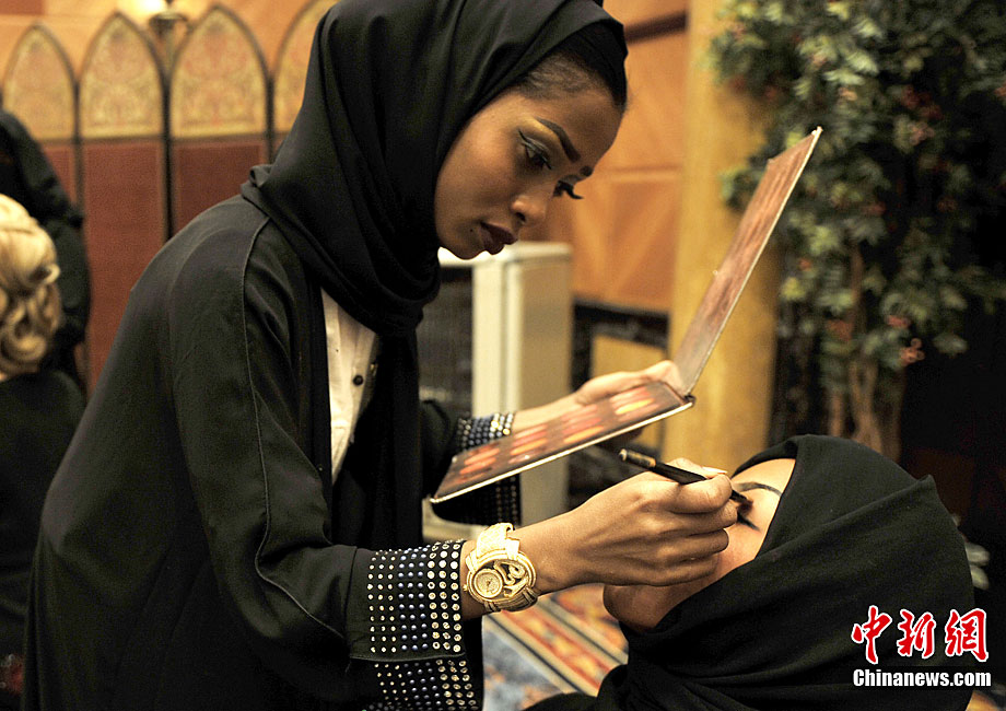 當(dāng)?shù)貢r間12月21晚,沙特2010化妝用品博覽會在沙特阿拉伯的吉達市舉行,此次博覽會為期四天。圖為沙特婦女在博覽會上進行現(xiàn)場化妝。