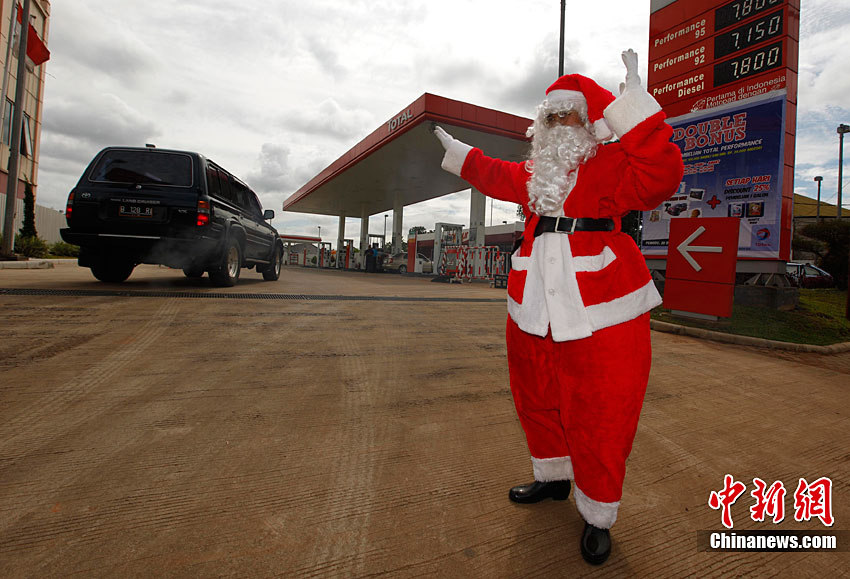 12月23日,印度尼西亞坦格朗市的一座加油站內(nèi),工作人員身著圣誕老人的服裝,為過往車輛加油、洗車。