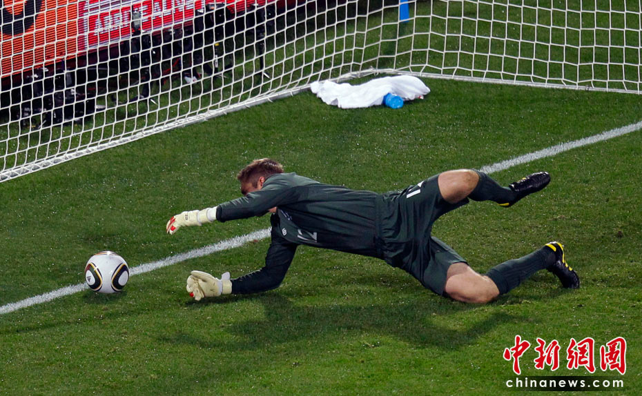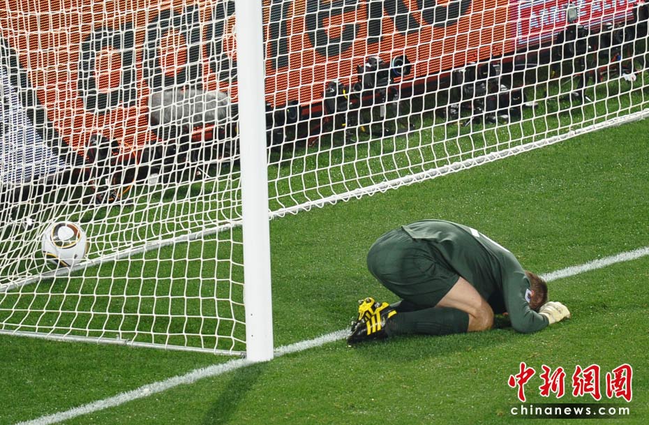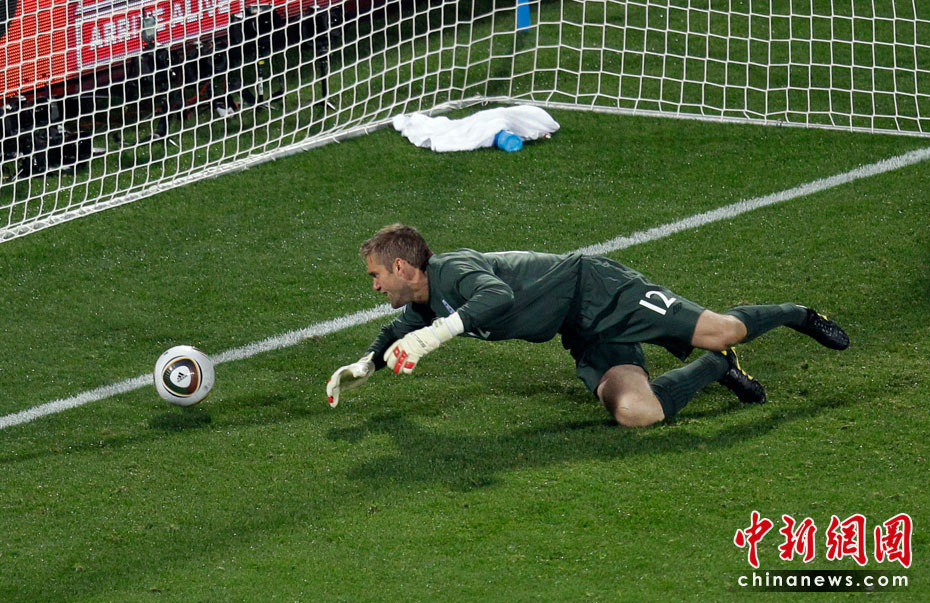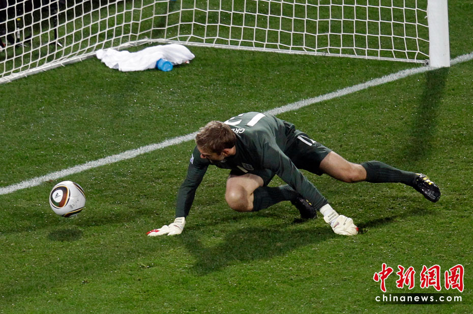 在13日凌晨2:30開始的一場(chǎng)南非世界杯小組賽中,英格蘭隊(duì)迎來了首個(gè)對(duì)手美國(guó)隊(duì),雖然蘭帕德在比賽開始后先拔頭籌,但上半場(chǎng)臨近結(jié)束前守門員格林的一次超低級(jí)失誤斷送好局,最終雙方1-1握手言和。 圖為格林失誤的瞬間。