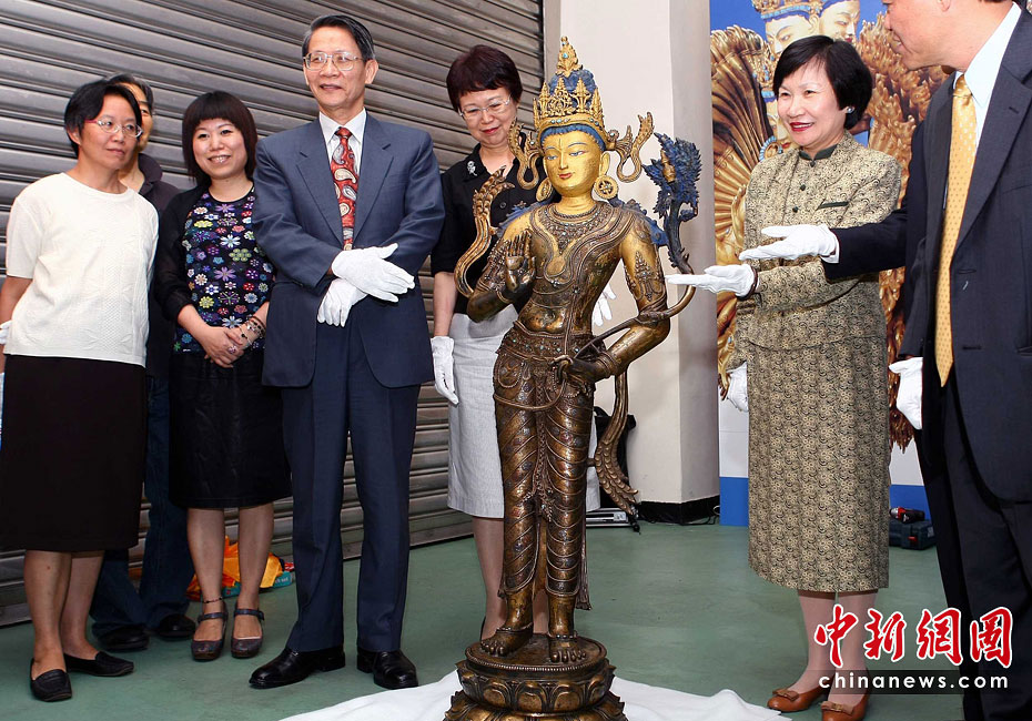 6月25日,工作人員將“鎏金銅彌勒菩薩像”、“金翅白海螺法號”、“八瓣蓮花曼荼鑼”等3件重量級文物開箱。7月1日,臺灣故宮博物院將舉辦“圣地西藏---最接近天空的寶藏”特展,展覽分“吐蕃王朝”、“金色寶藏”、“文化交流”、“雪域風(fēng)情”四部分,共有130組件文物參展。中新社記者 宋吉河 攝