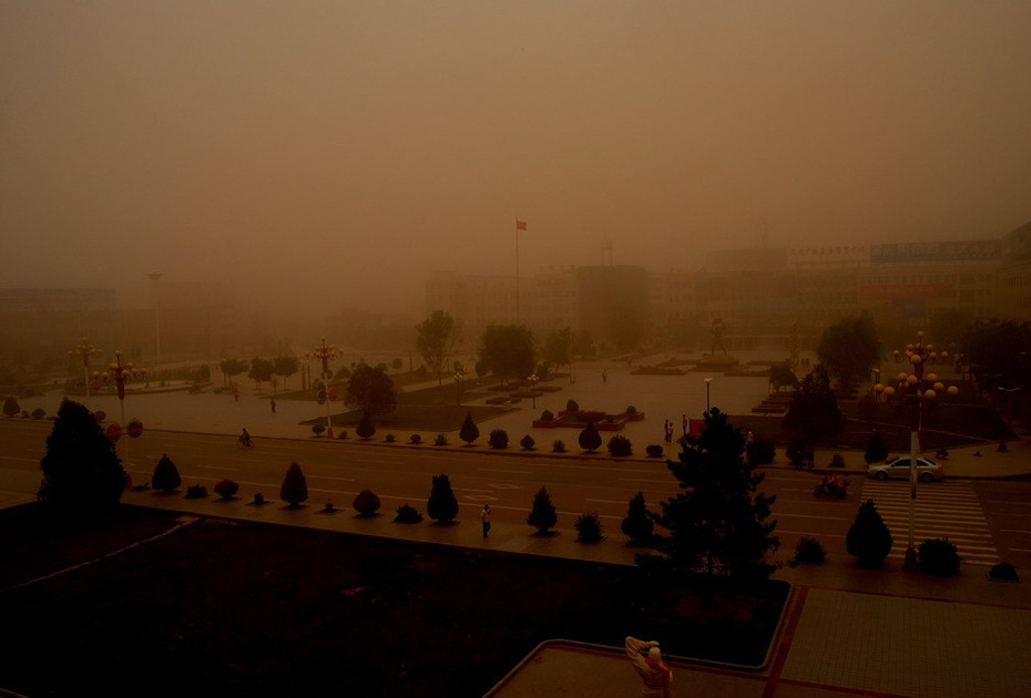 6月27日,甘肅民勤城區(qū)遭到沙塵襲擊。當(dāng)日下午4時左右,甘肅省武威市民勤縣又遭沙塵暴襲擊,黃黑的沙塵迅速籠罩整個縣城,能見度大幅降低。今年4月24日甘肅民勤曾遭特大沙塵暴襲擊。 圖片來源:新華網(wǎng) 李軍 攝