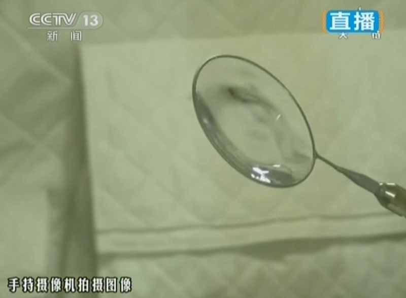 6月20日上午10時(shí)許,神舟十號(hào)航天員進(jìn)行中國(guó)首次太空授課,女航天員王亞平擔(dān)任主講,成為中國(guó)首位“太空教師”。圖為王亞平進(jìn)行“水膜”演示。(視頻截圖)