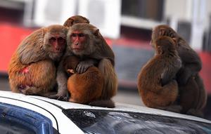 猴子聚堆爬車(chē)頂取暖