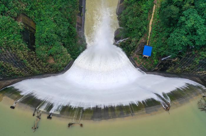 近日連降大雨,廣西桂林市全州縣源口水庫溢洪瀑布迎來最佳觀賞期。無人機(jī)俯瞰水庫溢洪口,一泓碧水從50余米壩面流落,宛如一把柔美的白色蒲扇輕柔落下,美輪美奐。源口水庫雨季溢洪場(chǎng)景已成為當(dāng)?shù)厥忻翊蚩ǖ亍?圖片來源:ICphoto