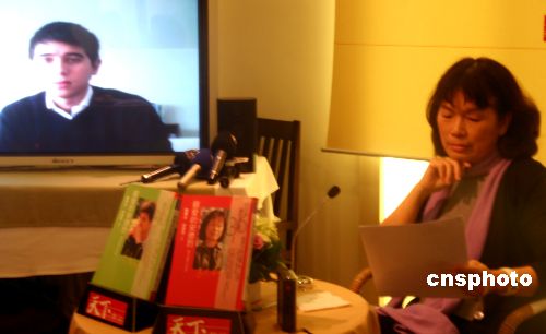 臺灣作家龍應(yīng)臺與長子安德烈(圖左)的三十六封家書在臺北輯錄出版。圖為在香港大學(xué)就讀經(jīng)濟(jì)系、有德國血統(tǒng)的安德烈,以視訊方式參與十一月七日下午于臺北舉辦的一場茶會。龍應(yīng)臺表示,兩代人之間也要尋找方法,開一扇溝通之門。中新社發(fā) 劉舒凌 攝