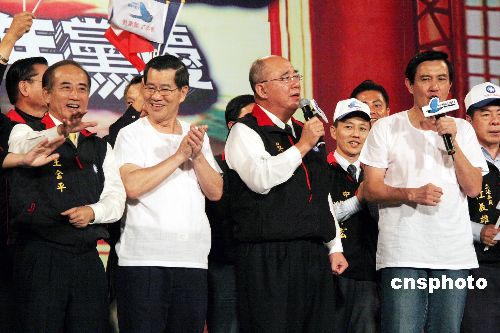 11月24日,中國(guó)國(guó)民黨在臺(tái)灣中部的嘉義市舉行萬(wàn)人造勢(shì)活動(dòng),紀(jì)念該黨成立一百一十三周年,也為明年臺(tái)灣的兩次重要選舉拉抬聲勢(shì)。圖為馬英九、蕭萬(wàn)長(zhǎng)、吳伯雄、王金平等全體與會(huì)者高唱《我們都是一家人》、《愛(ài)拚才會(huì)贏》等歌。整個(gè)造勢(shì)活動(dòng)突出“拚經(jīng)濟(jì)、顧生活”的訴求和“以臺(tái)灣為主,對(duì)人民有利”的主題。中新社發(fā) 黃少華 攝