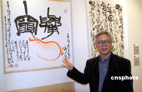 臺(tái)灣知名書法家林章湖介紹參展“實(shí)驗(yàn)”書法作品。
