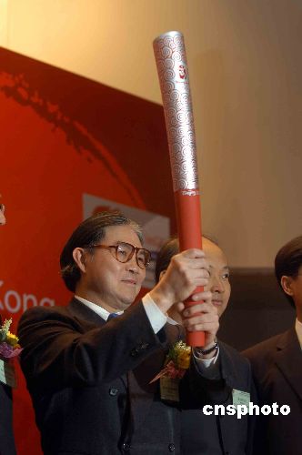 一月三十日,中國香港體育協(xié)會暨香港奧林匹克委員會會長霍震霆在新聞發(fā)布會上,展示北京奧運會火炬。港協(xié)暨奧林匹克委員會當天宣布,北京奧運火炬?zhèn)魉蛯⒂诮衲晡逶露盏竭_香港,一百二十名火炬手,會在港九、新界等六個路段傳送火炬。中新社發(fā) 譚達明 攝