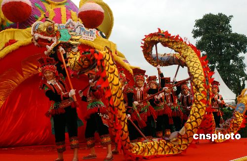一月三十一日,穿上傳統(tǒng)民族服式、來自云南的女子舞龍隊(duì)在香港海洋公園演繹金龍獻(xiàn)瑞,向游客及市民拜年。當(dāng)日,香港海洋公園公布在農(nóng)歷新年期間,將推出冰上百老匯、金銀滿冰宮、女子舞龍大匯演、醒獅賀歲等八十八個(gè)新春熱點(diǎn)。中新社發(fā) 蔡蔓莉 攝