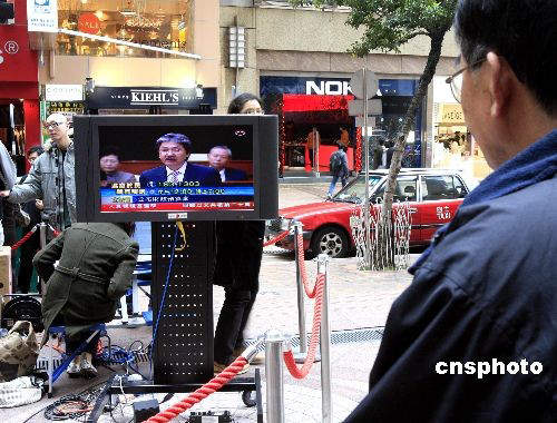 二月二十七日,香港財政司司長曾俊華向立法會提交二零零八至零九年度財政預(yù)算案,公布政府綜合盈余達(dá)一千一百五十六億元,創(chuàng)歷來新高,并推出多項減稅和惠及社會的措施。當(dāng)?shù)仉娨暸_街頭直播曾俊華作報告,并收集市民意見。中新社發(fā) 王麗南 攝
