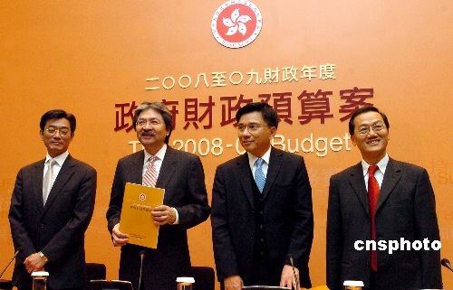 二月二十七日,香港財政司司長曾俊華(左二)、財經(jīng)事務(wù)及庫務(wù)局局長陳家強(左三)、政府經(jīng)濟顧問郭國全(右一)等出席二零零八至零九年度財政預(yù)算案記者會,回答記者有關(guān)提問。中新社發(fā) 鄧慶樂 攝