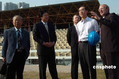 三月四日下午,香港署理行政長官唐英年(右二)與多名局長、警務(wù)處長,連同北京奧組委官員參觀由沙田香港體育學院改建而成的奧運及殘奧馬術(shù)主要比賽場地和相關(guān)配套工程。中新社發(fā) 譚達明 攝
