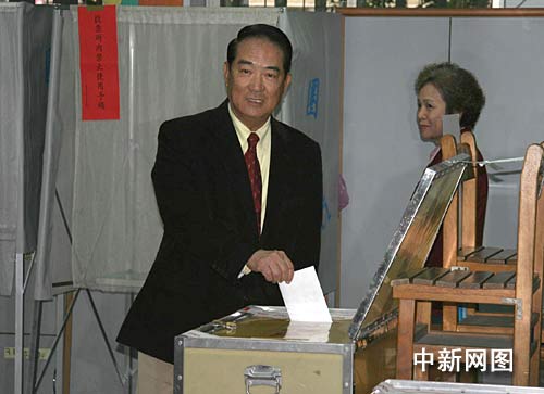 二00八臺灣地區(qū)領(lǐng)導(dǎo)人選舉投票二十二日上午八點開始,親民黨主席宋楚瑜攜夫人陳萬水一同前往前往投票所投票。曾嘉 攝