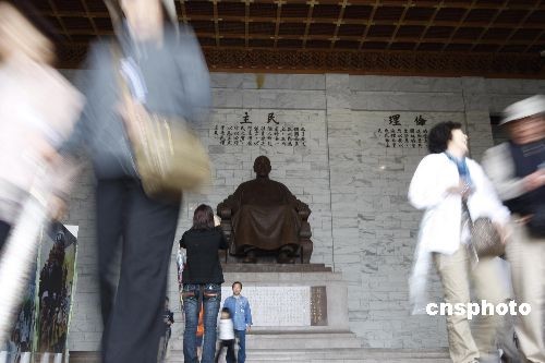 4月1日,因更名引發(fā)爭議的臺北“中正紀(jì)念堂”蔣介石銅像大廳懸掛的風(fēng)箏已經(jīng)拆除,目前剩下大廳中央的鋼架以及兩側(cè)的布幕尚未撤除。圖為游客參觀“中正紀(jì)念堂”蔣介石銅像大廳。中新社發(fā) 杜洋 攝