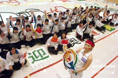 四月二十九日,香港將軍澳東港城商場為迎接北京奧運的來臨,特別舉行“骨牌迎奧運倒數一百天”活動,以十萬塊骨牌砌成面積達三千平方呎的“奧運之城”。圖為參與堆砌骨牌活動的學生在推倒骨牌后雀躍留影。中新社發(fā) 鄧慶樂 攝