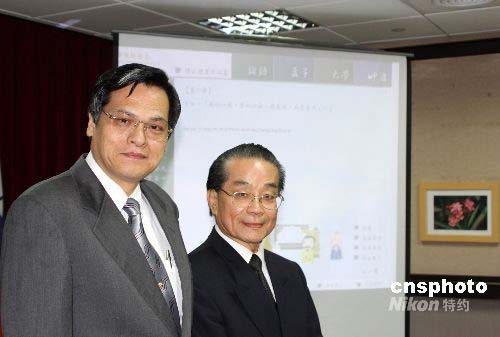 五月十三日下午,由“陸委會(huì)”主管的中華發(fā)展基金舉行《雅音四書集粹》推介會(huì)。推介以古漢語音韻誦讀的論語等“四書”。圖為“陸委會(huì)”主委陳明通(左一)、臺(tái)灣傳統(tǒng)詩學(xué)會(huì)副理事長黃冠人在推介會(huì)上。中新社發(fā) 陳立宇 攝
