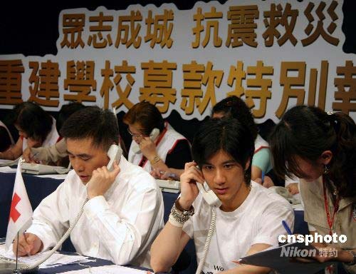 十七日,臺(tái)灣一電視臺(tái)與香港電視臺(tái)聯(lián)線舉辦“眾志成城抗震救災(zāi)重建學(xué)校募款特別報(bào)道”,協(xié)助四川震災(zāi)過(guò)后學(xué)校重建。圖為臺(tái)北市市長(zhǎng)郝龍斌與歌手王力宏加入募款行列,擔(dān)任捐款專線接線志工,共襄義舉。中新社發(fā) 劉舒凌 攝
