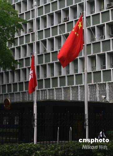 五月十九日是全國哀悼日,香港特區(qū)政府下半旗,對四川大地震遇難者表示深切哀悼。中新社發(fā) 武仲林 攝