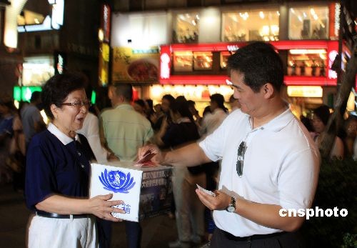 五月二十日晚,一名臺灣民眾在街頭見到為四川賑災(zāi)募捐的慈濟義工,毫不遲疑掏出一把鈔票塞入募捐箱。