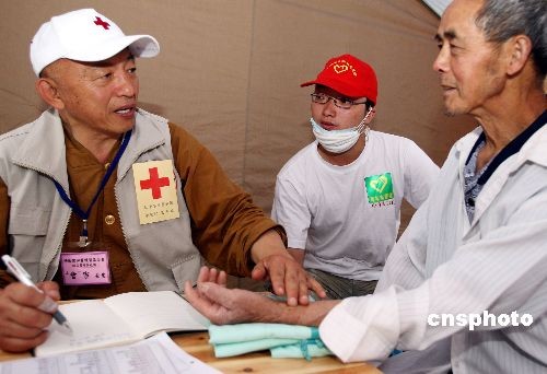 5月21日上午,臺(tái)灣紅十字醫(yī)療隊(duì)在四川省廣漢市高坪鎮(zhèn)災(zāi)民安置中心安營(yíng)扎寨開展醫(yī)療救治。醫(yī)療隊(duì)的中醫(yī)師陳友鳳先生(左),為一名什邡市龍居村65歲的老漢把脈診病。由于當(dāng)?shù)剞r(nóng)民地方口音極重,一名會(huì)說普通話的四川大學(xué)生志愿居中擔(dān)任翻譯。