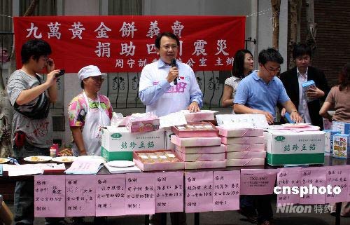 五月二十三日上午,國民黨“立委”周守訓(xùn)(左三)與“牛媽媽公益之家”合辦(左二為牛媽媽),在臺灣“立法機關(guān)”內(nèi)義賣黃金餅,收入將全部捐給臺灣紅十字會,作為四川震災(zāi)后的重建基金,該活動得到不少“立委”和工作人員的支持。中新社發(fā) 陳立宇 攝