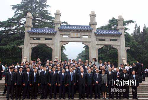 中國國民黨主席吳伯雄率領(lǐng)中國國民黨訪問團(tuán)5月27日上午8時20分左右抵達(dá)南京中山陵,隨后舉行拜謁儀式,向?qū)O中山先生坐像敬獻(xiàn)花圈、宣讀祭文、行鞠躬禮。圖為吳伯雄一行在南京中山陵前合影。作者:盛佳鵬