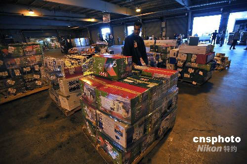 當(dāng)?shù)貢r間5月28日,美國硅谷華人工程師將向四川地震災(zāi)區(qū)捐贈的2000多頂帳篷、1000多個睡袋等賑災(zāi)物資交付美國聯(lián)合航空公司,這批賑災(zāi)物資將先運往北京首都國際機場,然后再轉(zhuǎn)運四川災(zāi)區(qū)。中新社發(fā) 陳剛 攝