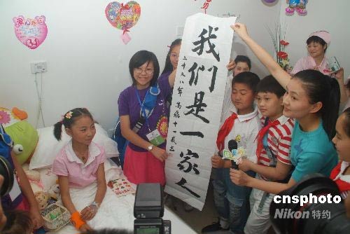 5月31日,“閩臺(tái)少兒心系災(zāi)區(qū)”手拉手活動(dòng)在福州進(jìn)行,來(lái)自臺(tái)灣澎湖馬公小學(xué)的80名同學(xué)將陸續(xù)與汶川災(zāi)區(qū)的轉(zhuǎn)院小傷員見(jiàn)面。圖為3名馬公小學(xué)學(xué)生代表來(lái)到了南京軍區(qū)福州總醫(yī)院看望災(zāi)區(qū)小朋友林玉如,贈(zèng)送了親手制作的小荷包等禮物,并合唱了一首《童話(huà)》。中新社發(fā) 吳志 攝