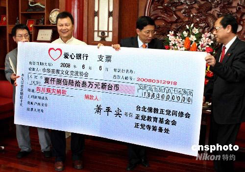 6月6日,臺(tái)灣佛教正覺同修會(huì)、正覺教育基金會(huì)、正覺寺籌備處等在北京國家宗教事物局向四川地震災(zāi)區(qū)捐獻(xiàn)1863萬元新臺(tái)幣,以幫助四川災(zāi)區(qū)受傷人員、學(xué)校重建、寺廟修繕等。圖為捐贈(zèng)儀式上,臺(tái)灣佛教正覺同修會(huì)董事長(zhǎng)張公仆先生(左二),向國家宗教事物局副局長(zhǎng)蔣永堅(jiān)(右二)遞交支票樣本。中新社發(fā) 宋吉河 攝