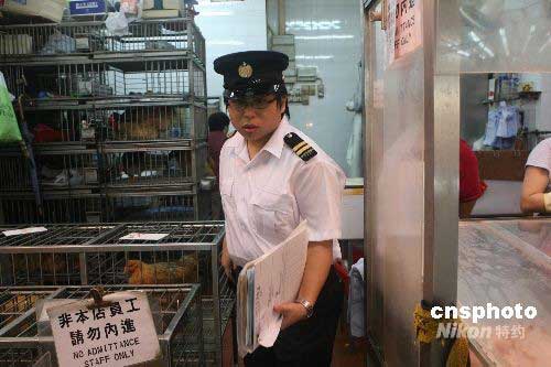 六月七日,香港一名工作人員對銅鑼灣街市一家活雞攤檔進(jìn)行巡查。香港食物及衛(wèi)生局局長周一岳當(dāng)日表示,確定月初在保安道街市抽取的五個(gè)雞只樣本,帶有H5N1禽流感病毒,特區(qū)政府對禽流感的應(yīng)變級別將由原來的“戒備”級別,升為“嚴(yán)重”級別。中新社發(fā) 武仲林 攝