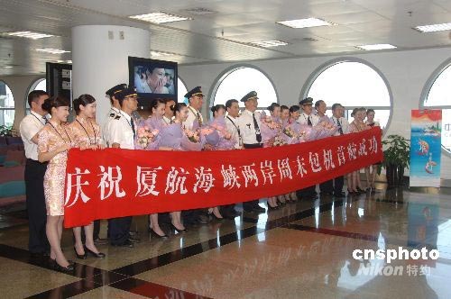 7月4日,作為首架降落臺北松山機場大陸民航客機,從松山乘載202位客人返抵廈門高崎場后,廈航MF-881班機全體駕乘人員合影慶賀往返分別以80分鐘時間正點執(zhí)乘。機長沈志群介紹,航班抵達臺北松山機場時,受到當?shù)馗鹘缫浴坝L洗塵”為主題的禮遇迎接。中新社發(fā) 鄭祚聲 攝