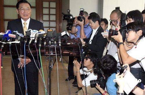 七月十八日,香港特區(qū)行政長官曾蔭權在禮賓府會見臺灣;鶗麻L江丙坤。圖為會面后江丙坤接受媒體的采訪。中新社發(fā) 張勤 攝