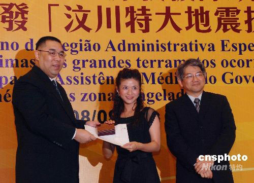 澳門特區(qū)政府社會文化司司長崔世安(左)及衛(wèi)生局局長李展?jié)?右)九月三日晚向澳門援助四川地震災(zāi)區(qū)的三批五十六名醫(yī)護(hù)人員逐一頒發(fā)獎狀及四川省政府贈送的“抗震救災(zāi)紀(jì)念章”,以表彰他們的貢獻(xiàn)。中新社發(fā) 畢永光 攝