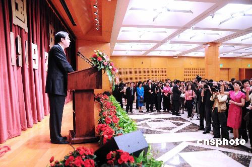 中國(guó)駐美大使周文重大使美東時(shí)間九月二十八日晚在駐美大使館新館舉行華僑華人國(guó)慶招待會(huì)。圖為周文重在大使館新館國(guó)慶招待會(huì)上致辭。中新社發(fā) 邱江波 攝